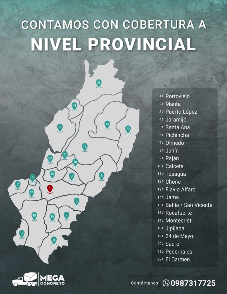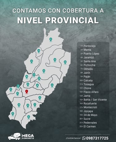 En Megaconcreto, llegamos a cada rincón de la provincia de Manabí para ofrecerte el mejor concreto premezclado, con la calidad y puntualidad que tu proyecto necesita. Nuestra cobertura total garantiza que, sin importar dónde te encuentres, recibirás un servicio confiable, rápido y respaldado por años de experiencia en la industria. ¡Construimos contigo, estés donde estés!