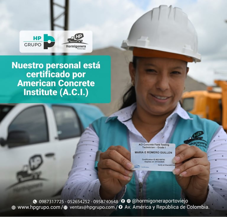 En Megaconcreto, la calidad empieza con nuestro equipo. Contamos con personal certificado por el American Concrete Institute (A.C.I.), una acreditación internacional que respalda nuestros conocimientos y habilidades en el control y ensayo de concreto. Esta certificación garantiza que cada mezcla entregada cumple con rigurosos estándares técnicos, asegurando resistencia, durabilidad y el mejor desempeño para tu proyecto.